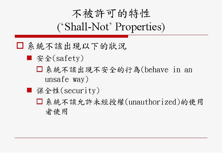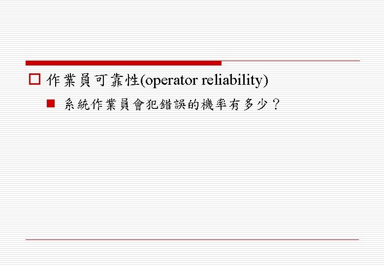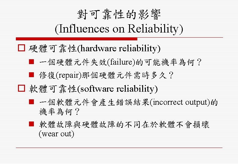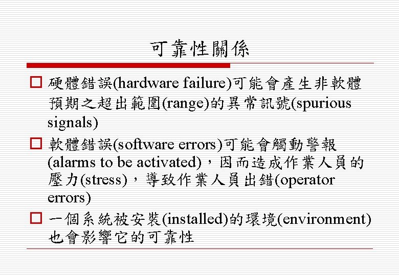 n Examples o 可靠性(reliability) o 效能(performance) o 安全(safety) o 保全(security)