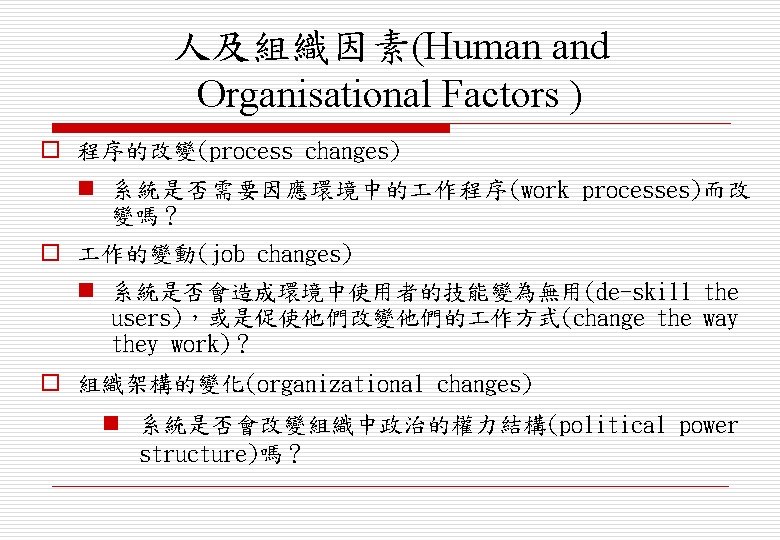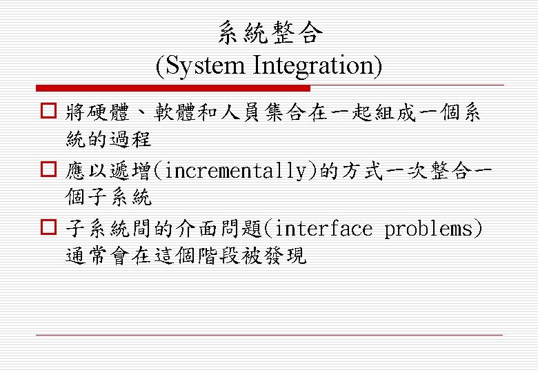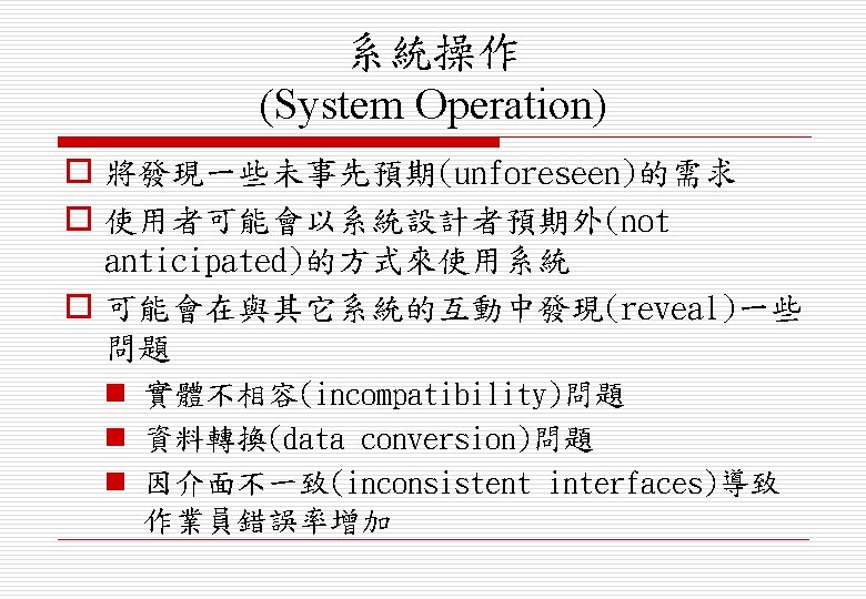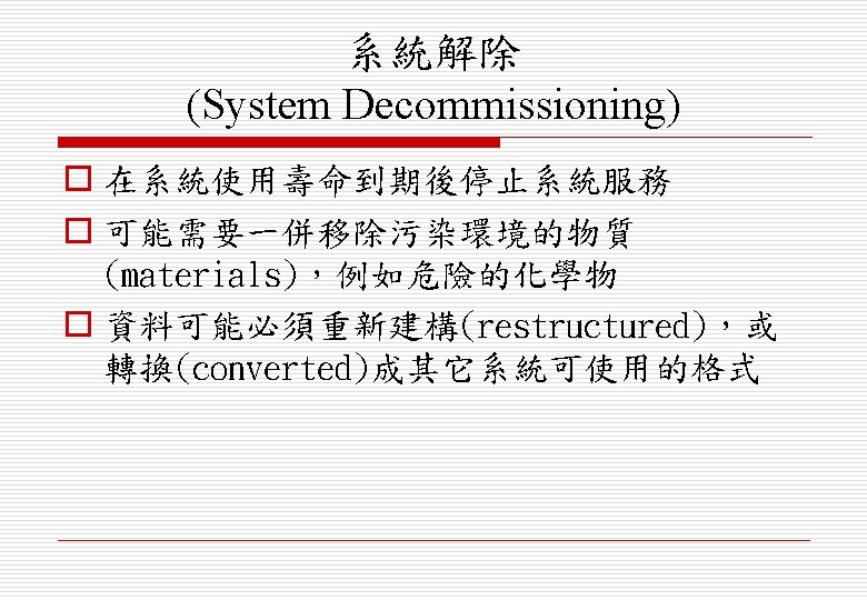 系統安裝 (System Installation) o 環境假設(environmental assumptions)可能不 正確 o 人員可能會抗拒(human resistance)新系統的引 入 o 系統可能需與其他替代系統(alternative system)並存(coexist)一段時間 o 可能會有實體的安裝(physical installation) 問題,例如佈線(cabling)問題 o 需確認作業員所需的訓練(operator training)