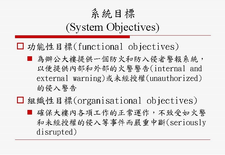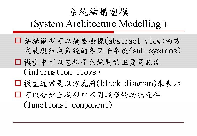 系統需求定義 (System Requirements Definition) o 摘要式功能性需求(abstract functional requirements) n 以摘要方式(abstract way)定義系統功能 o 系統特性(system properties) n 定義系統的非功能性(non-functional)需求 o 非期望特性(undesirable characteristics) n 不可接受(unacceptable)的系統行為