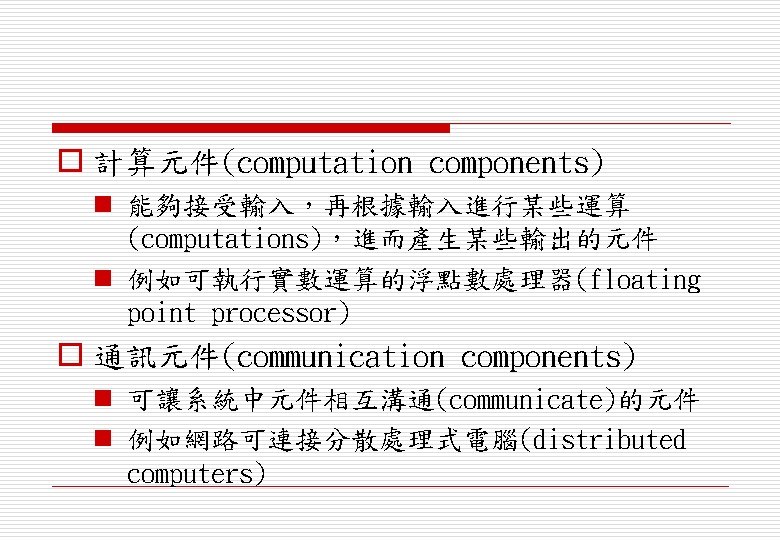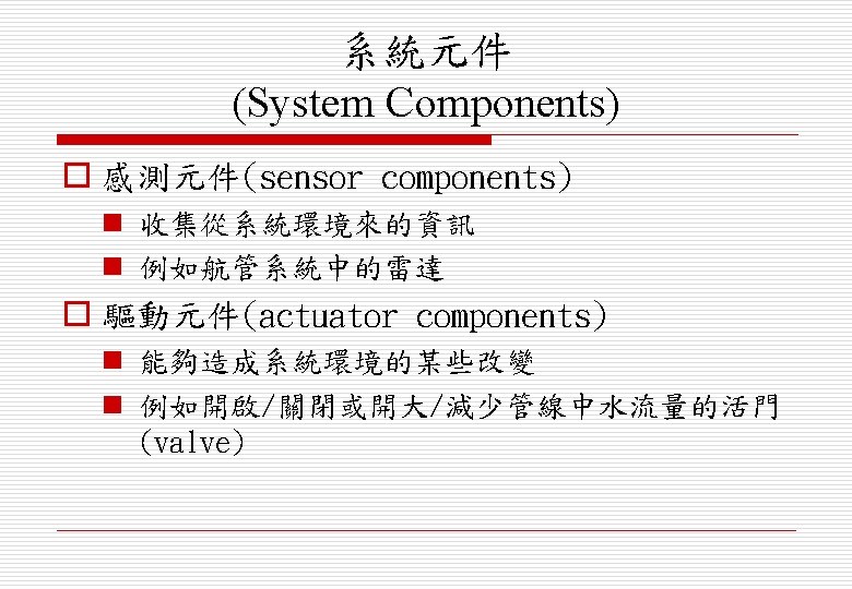 o 協調元件(co-ordination components) n 用來協調與其它系統元件互動的元件 n 例如即時系統(real-time)中的排程程式 (scheduler) o 介面元件(interface components) n 便捷化(facilitate)與其它系統元件互動 (interactions)的元件 n 例如作業員的操作員介面(operator interface)