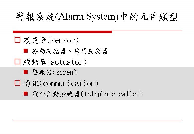 o 協調(co-ordination) n 警報控制器(alarm controller) o 介面(interface) n 聲音合成器(voice synthesizer)