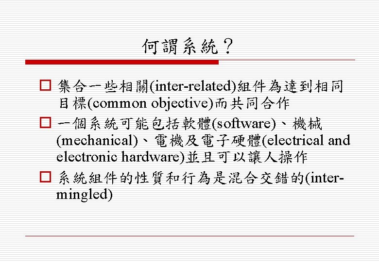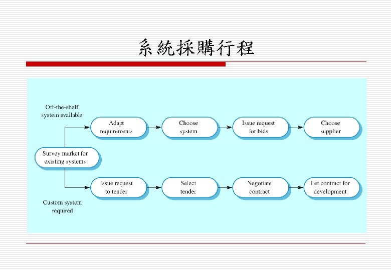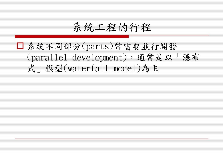 主題 o 衍生的系統特性(emergent system properties) o 系統及其環境(systems and their environment) o 系統塑模(system modelling) o 系統 程行程(system engineering process) o 系統採購(system procurement)