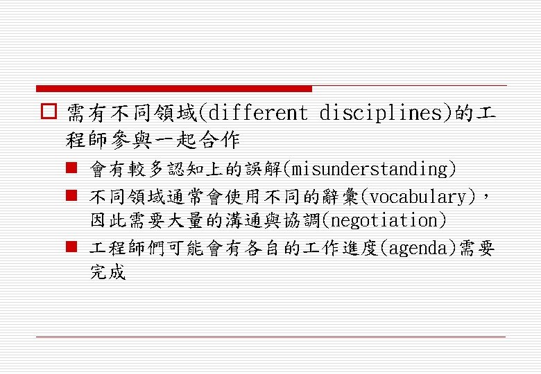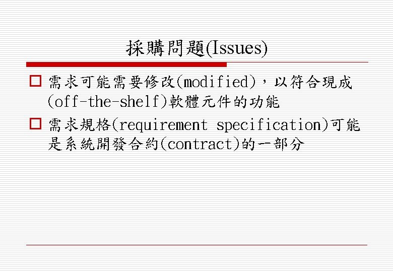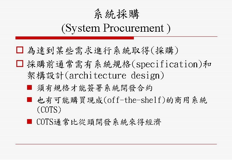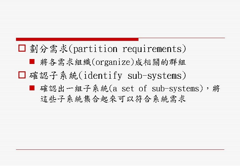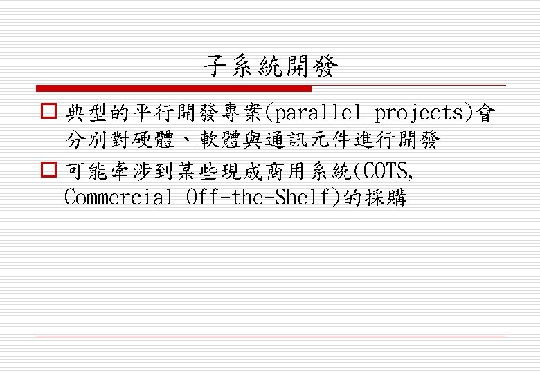 o 分派需求給各子系統(assign requirements to sub-systems) n 當系統有整合COTS (Commercial Off-the. Shelf) 時可能會造成特殊的問題 o 界定各子系統功能(specify sub-system functionality) o 定義各子系統介面(define sub-system interfaces)