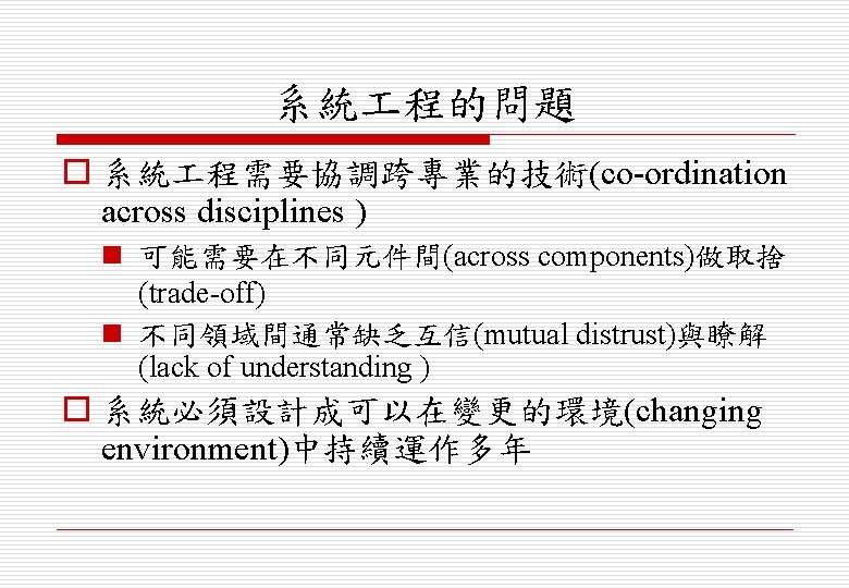 系統 程 (Systems Engineering) o 設計(design)、實作(implement)、建置 (deploy)及操作(operate)包括軟/硬體(h/w & s/w)及人員(people)的系統