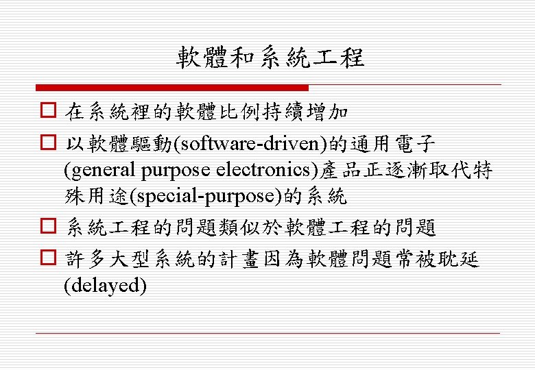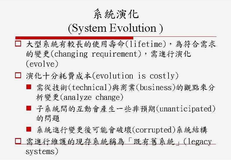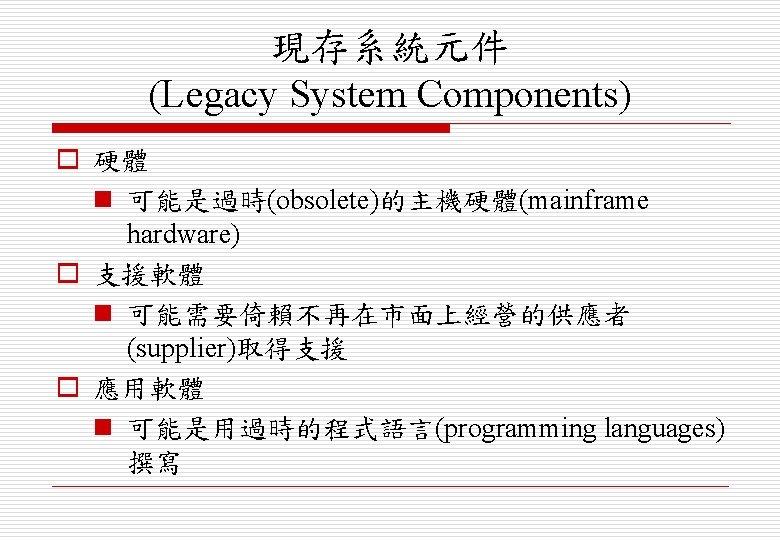 現存系統 (Legacy Systems) o 現存系統對商業運轉(business operation)十分重要, 丟棄現存系統的風險太高(risky) n 銀行客戶會計系統(bank customer accounting system) n 飛機維修系統(aircraft maintenance system) o 現存系統會限制新的業務流程(constrain new business processes),並且會耗費公司的龐大預算 (budgets)