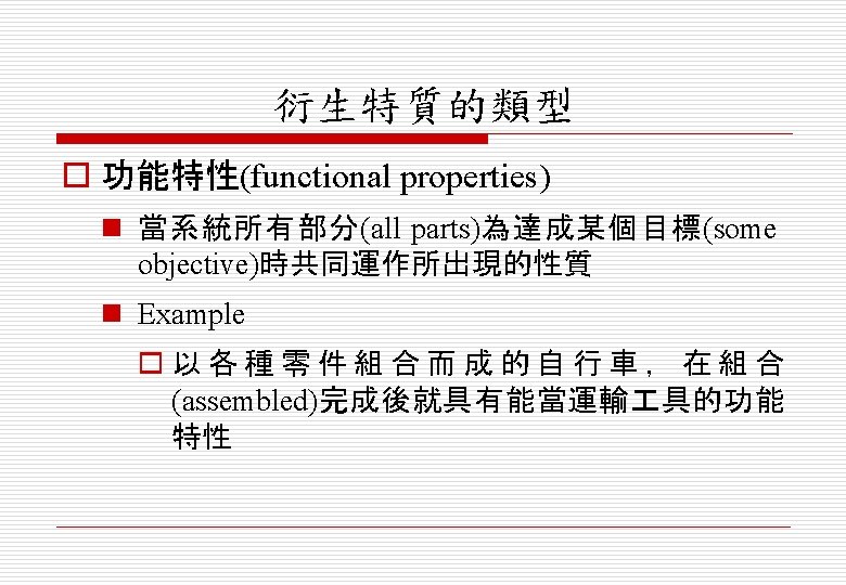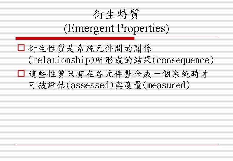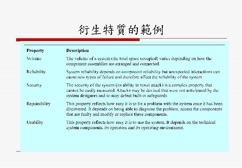 o 非功能衍生特性(non-functional emergent properties) n 與操作環境(operational environment)中的系統行 為(behaviour)有關 n 只要系統無法達到所定義的最低等級(minimal defined level)性質,系統就會被視為無法使用 (unusable)