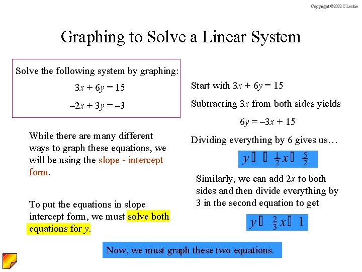 Graphing to Solve a Linear System Solve the following system by graphing: 3 x + 6 y = 15 – 2 x + 3 y = – 3 Start with 3 x + 6 y = 15 Subtracting 3 x from both sides yields 6 y = – 3 x + 15 While there are many different ways to graph these equations, we will be using the slope - intercept form. To put the equations in slope intercept form, we must solve both equations for y. Dividing everything by 6 gives us… Similarly, we can add 2 x to both sides and then divide everything by 3 in the second equation to get Now, we must graph these two equations.