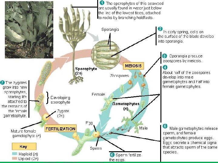 Pohlavní rozmnožování řas ► samčí gamety jsou pohyblivé, haploidní(n), pohybují se pomocí bičíku (vyjma ruduch) a nazývají se spermatozoidy ► samičí gamety jsou haploidní, jsou nazývány vaječné buňky ► splynutím spermatozoidu a vaječné buňky vzniká zygota (2 n)