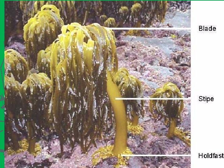 Chromophyta (Chromophyta) Phaeophyceae (Hnědé řasy) asi 2000 popsaných druhů, hlavně v moři, stélky dobře rozlišené na rhizoidy, kauloid a fyloid ► phaios = hnědý ► všechny jsou mnohobuněčné ► často mají měchýřky naplněné plynem, které umožňují řase se vznášet ve vodě ► dobře se jim daří zejména v chladnějších mořích ► chlorofyl a, chlorofyl c a navíc karotenoidy, které odpovídají za jejich hnědou barvu ► chloroplasty obsahují fukoxantin, podobně jako u rozsivek ►
