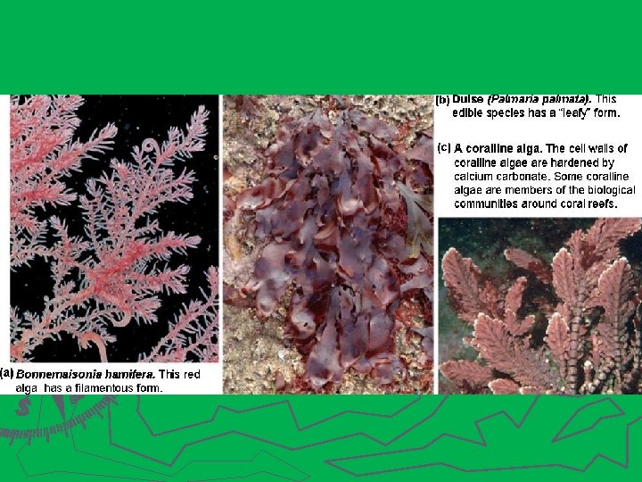 Říše : PLANTAE Rhodophyta (Ruduchy) asi 6 000 druhů, většinou mořské, časté na korálových útesech, jen asi 150 – 200 sladkovodní ► Jejich počet a ekologický význam ubývá směrem od rovníku k pólům ► chlorofyl a; krom něj i tzv. phycobiliny, pigmenty, které těmto řasám umožňují žít i ve velkých hloubkách s minimem světla, využívají zde modrozelené světlo, které pronikne i do velkých hloubek ► poblíž San Salvadoru žijí i v 210 m hloubce, a jsou tak nejhlouběji rostoucí eukaryota ► chloroplasty mají dvě membrány ►