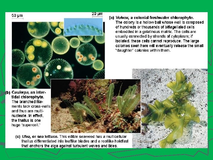 Chlorophyta (Zelené řasy) ► zelení bičíkovci: Chlamydomonas, Volvox globator (Váleč koulivý) ► Volvox vytváří zvláštní typ kolonie, tzv. cenobium. Cenobium je tvořeno bičíkatými buňkami s bičíky směřujícími směrem ven, uvnitř této duté koule jsou nebičíkaté buňky, jejichž úkolem je rozmnožování – zakládání dceřinných cenobií