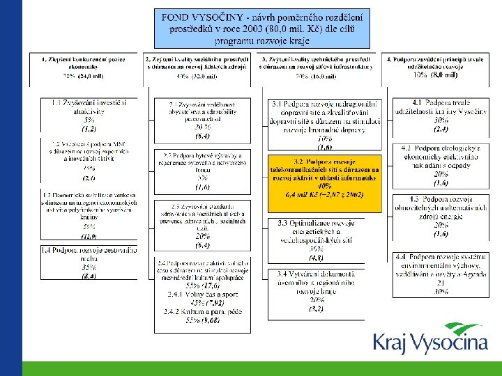 Grantový program „Obce na síti“ Obce na síti III – základní vybavení obecních úřadů 1, 3 mil Kč (50%), nákup stanic a základního sw, obce kraje Vysočina Uzávěrky 10. 3. 2003, 9. 5. 2003 36 úspěšných žadatelů v 1. kole (z 56) Celkové výsledky grantových programů Obce na síti 2002 -2003: vybaveno cca 150 obcí Investice celkem 6 mil Kč Kraj – 3, 2 mil Kč Obce – 2, 8 mil Kč