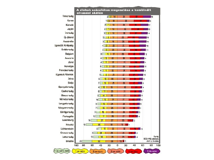 Összehasonlító vizsgálatok • IEA 1970/71 „A magyar gyerekek nem tudnak olvasni. ” • OECD 1998. 18/22. hely. Hazai átlag nem éri el a hármast. • PISA 2000 Magyarország 23/32, a listán minden tényező tekintetében az utolsó csoportba tartozik. 5% ötös, 23% egyes! • PISA 2003 Magyarország 25/40 (0, 72. . 0, 62)