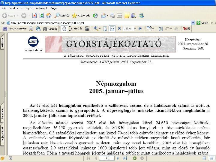 Tegnapi hír • Az előzetes adatok szerint 2011 első kilenc hónapjában 65 ezer 539 gyermek született, 3, 8 százalékkal kevesebb, mint egy évvel korábban. A halálozások száma 95 ezer 657 volt, ez 0, 8 százalékos csökkenést jelent a 2010. január-szeptemberi időszakhoz képest. • Az adatok szerint a természetes fogyás 30 ezer 118 fő volt, 1799 -cel több az egy évvel korábbinál, így a 2001. évi népszámlálás alapján továbbvezetett népesség becsült lélekszáma a nemzetközi vándorlás figyelembevételével 9 millió 964 ezer volt az időszak végén. • Az év első kilenc hónapjában 29 ezer 519 házasságkötést regisztráltak, ez a szám 365 -tel, azaz 1, 2 százalékkal maradt el az egy évvel korábbi adattól. Ezer lakosra csaknem 9 élve születés és mintegy 13 halálozás jutott, ezek az adatok 0, 3, illetve 0, 1 ezrelékponttal alacsonyabbak az egy évvel korábbinál - olvasható a KSH közleményében. • Népszabadság online http: //nol. hu/belfold/tovabb_csokkent_a_szuletesek_szama 2011. 23.