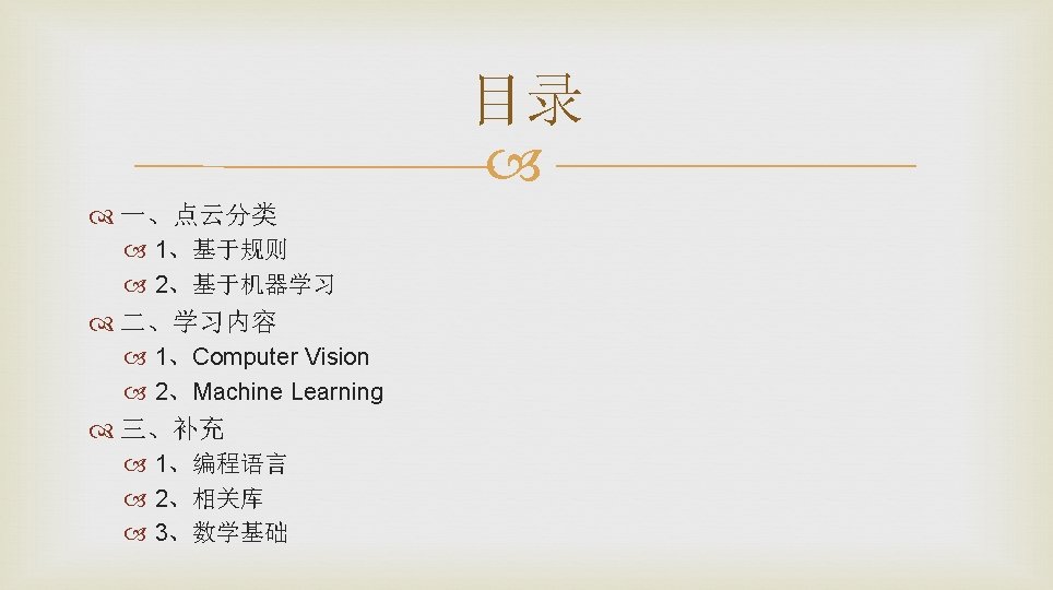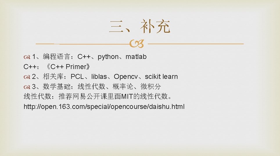 Szeliski Computer Vision Algorithm and Application PPT http Slides: 13 Download presentation 二、学习内容 Szeliski 《Computer Vision: Algorithm and Application》 中文版 《计算机视觉:算法与应用》 参考课程:(PPT以及作业) http: //cs. brown. edu/courses/cs 143/ 入门课程: Stanford cs 131 http: //vision. stanford. edu/teaching/cs 131_fall 1415/schedule. html 二、学习内容 2、machine learning 目的:了解机器学习的基本原理。掌握一些调参的基本方法。 课程: Coursera(或者网易公开课)上Andrew Ng的Machine Learning课程 核心内容是该课程上的作业,用matlab完成。 https: //www. coursera. org/learn/machine-learning http: //open. 163. com/special/opencourse/machinelearning. html 教材: 网易公开课上Andrew Ng的Machine Learning课程的讲义 《Pattern Recognition and Machine Learning》Bishop(这本书比较难)