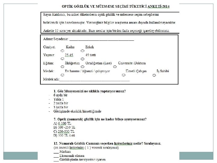 Bireysel sözlü iletişim �Anket: belli kişilerin ya da grupların bir konu üzerindeki duygu, düşünce ve deneyimlerini anlamak için belli bir plana göre hazırlanmış olan soru listeleridir. �Kolay, ucuz ve çok sayıda kişiden kısa sürede görüş alma olanağı sunar. �Anketi hazırlayan kişinin bilgili, tecrübeli olması önemlidir. �Yazılı iletişim türüdür. �Sorular, anketör tarafından cevaplayıcıya sözlü olarak sorulduğu durumlarda sözlü iletişim türü haline gelir.