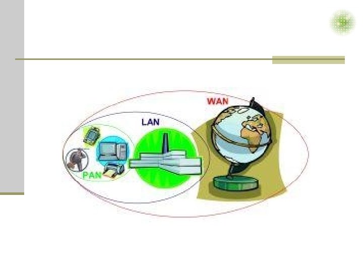 n PAN - (Personal Area Network) n Ez alatt az ember szűkebb 1 -2 m-es környezetét értjük n Például: laptopunk, pocket. PC-nk és mobiltelefonunk által alkotott hálózat.