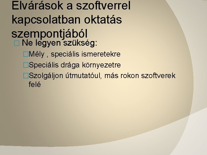 Elvárások a szoftverrel kapcsolatban oktatás szempontjából � Ne legyen szükség: �Mély , speciális ismeretekre �Speciális drága környezetre �Szolgáljon útmutatóul, más rokon szoftverek felé
