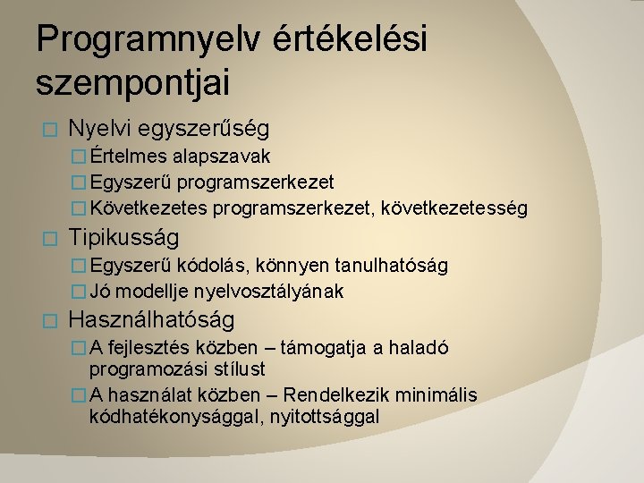 Programnyelv értékelési szempontjai � Nyelvi egyszerűség � Értelmes alapszavak � Egyszerű programszerkezet � Következetes programszerkezet, következetesség � Tipikusság � Egyszerű kódolás, könnyen tanulhatóság � Jó modellje nyelvosztályának � Használhatóság � A fejlesztés közben – támogatja a haladó programozási stílust � A használat közben – Rendelkezik minimális kódhatékonysággal, nyitottsággal