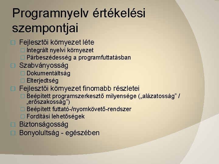 Programnyelv értékelési szempontjai � Fejlesztői környezet léte � Integrált nyelvi környezet � Párbeszédesség a programfuttatásban � Szabványosság � Dokumentáltság � Elterjedtség � Fejlesztői környezet finomabb részletei � Beépített programszerkesztő milyensége („alázatosság” / „erőszakosság”) � Beépített futtató-/nyomkövető-rendszer � Fordítási lehetőségek � � Biztonságosság Bonyolultság - egészében
