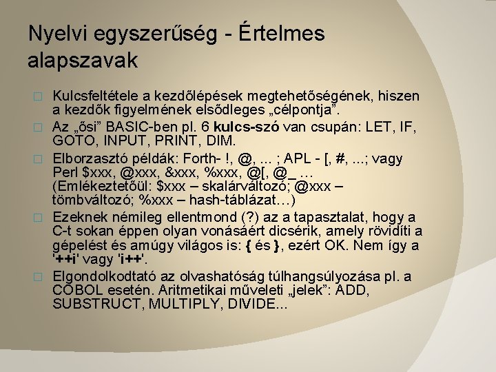 Nyelvi egyszerűség - Értelmes alapszavak � � � Kulcsfeltétele a kezdőlépések megtehetőségének, hiszen a kezdők figyelmének elsődleges „célpontja”. Az „ősi” BASIC-ben pl. 6 kulcs-szó van csupán: LET, IF, GOTO, INPUT, PRINT, DIM. Elborzasztó példák: Forth- !, @, . . . ; APL - [, #, . . . ; vagy Perl $xxx, @xxx, &xxx, %xxx, @[, @_ … (Emlékeztetőül: $xxx – skalárváltozó; @xxx – tömbváltozó; %xxx – hash-táblázat…) Ezeknek némileg ellentmond (? ) az a tapasztalat, hogy a C-t sokan éppen olyan vonásáért dicsérik, amely rövidíti a gépelést és amúgy világos is: { és }, ezért OK. Nem így a '++i' vagy 'i++'. Elgondolkodtató az olvashatóság túlhangsúlyozása pl. a COBOL esetén. Aritmetikai műveleti „jelek”: ADD, SUBSTRUCT, MULTIPLY, DIVIDE. . .