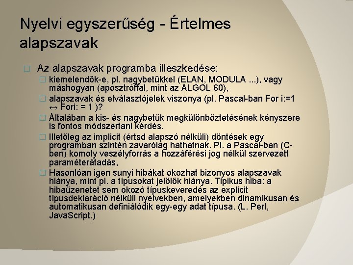 Nyelvi egyszerűség - Értelmes alapszavak � Az alapszavak programba illeszkedése: � kiemelendők-e, pl. nagybetűkkel (ELAN, MODULA. . . ), vagy máshogyan (aposztróffal, mint az ALGOL 60), � alapszavak és elválasztójelek viszonya (pl. Pascal-ban For i: =1 ↔ Fori: = 1 )? � Általában a kis- és nagybetűk megkülönböztetésének kényszere is fontos módszertani kérdés. � Illetőleg az implicit (értsd alapszó nélküli) döntések egy programban szintén zavarólag hathatnak. Pl. a Pascal-ban (Cben) komoly veszélyforrás a hozzáférési jog nélkül szervezett paraméterátadás, � Hasonlóan igen sunyi hibákat okozhat bizonyos alapszavak hiánya, mint pl. a típusokat jelölők hiánya. Tipikus hiba: a hibaüzenetet sem okozó típuskeveredés az explicit típusdeklaráció nélküli nyelvekben, amelyekben dinamikusan és automatikusan definiálódik egy-egy adat típusa. (L. Perl, Java. Script. )