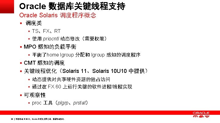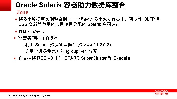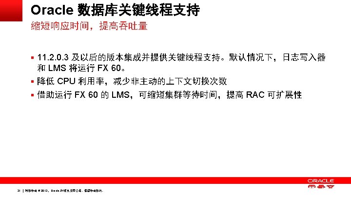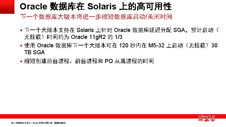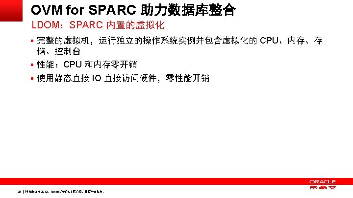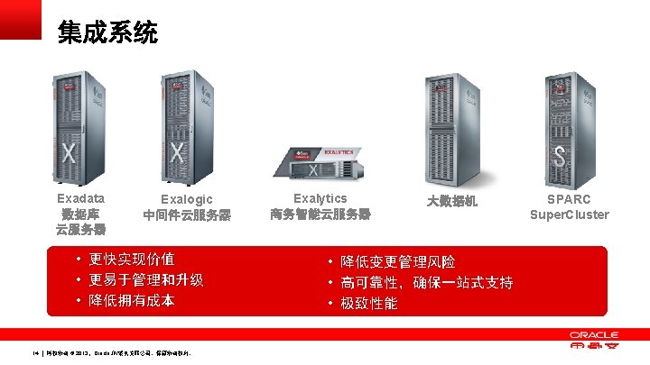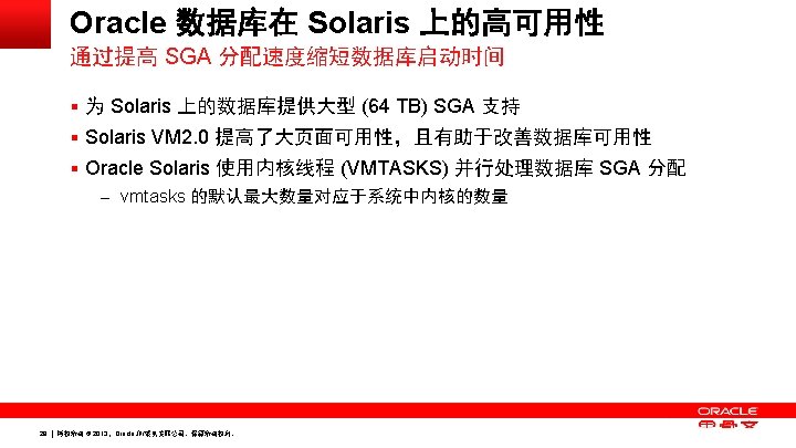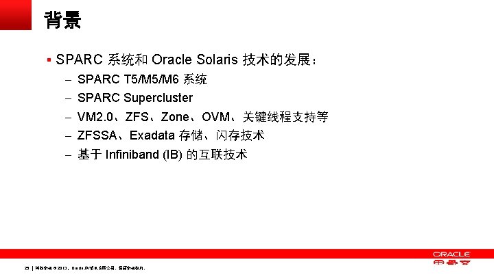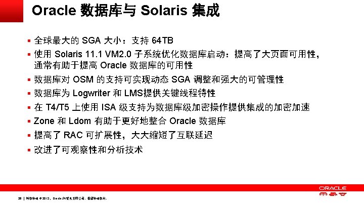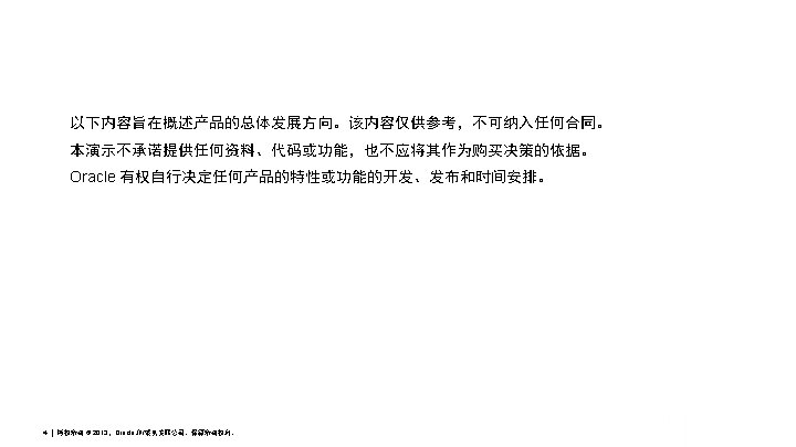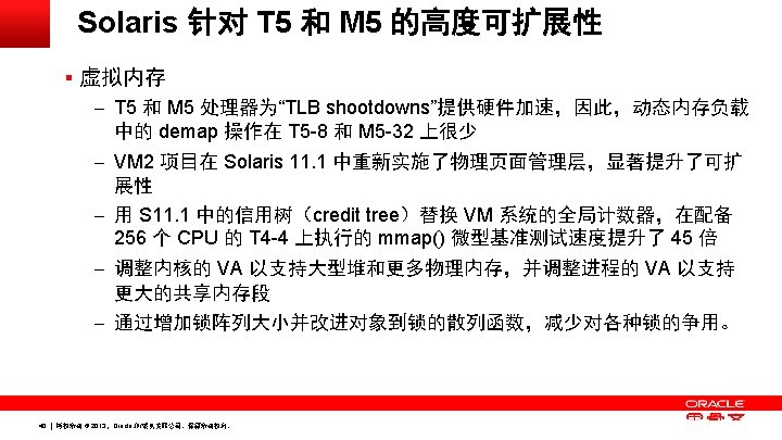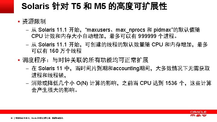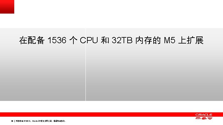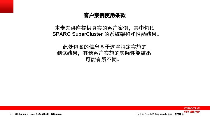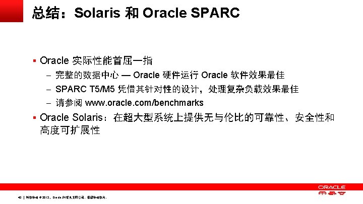 必要的基准测试披露声明 针对含基准测试结果的 SPARC T 5 和 M 5 演示文稿(第 2 页,共 2 页) §Copyright 2013, Oracle &/or its affiliates. All rights reserved. Oracle & Java are registered trademarks of Oracle &/or its affiliates. Other names may be trademarks of their respective owners. . §Two-tier SAP Sales and Distribution (SD) Standard Application benchmarks SAP Enhancement package 5 for SAP ERP 6. 0 as of 3/26/13: SPARC M 5 -32 (32 processors, 192 cores, 1536 threads) 85, 050 SAP SD users, 32 x 3. 6 GHz SPARC M 5, 4 TB memory, Oracle Database 11 g, Oracle Solaris 11, Cert# 2013009. SPARC T 5 -8 (8 processors, 128 cores, 1024 threads) 40, 000 SAP SD users, 8 x 3. 6 GHz SPARC T 5, 2 TB memory, Oracle Database 11 g, Oracle Solaris 11, Cert# 2013008. IBM Power 760 (8 processors, 48 cores, 192 threads) 25, 488 SAP SD users, 8 x 3. 41 GHz IBM POWER 7+, 1024 GB memory, DB 2 10, AIX 7. 1, Cert#2013004. Two-tier SAP Sales and Distribution (SD) Standard Application benchmarks SAP Enhancement package 4 for SAP ERP 6. 0 as of 4/30/12: IBM Power 795 (32 processors, 256 cores, 1024 threads) 126, 063 SAP SD users, 32 x 4 GHz IBM POWER 7, 4 TB memory, DB 2 9. 7, AIX 7. 1, Cert#2010046. SPARC Enterprise Server M 9000 (64 processors, 256 cores, 512 threads) 32, 000 SAP SD users, 64 x 2. 88 GHz SPARC 64 VII, 1152 GB memory, Oracle Database 10 g, Oracle Solaris 10, Cert# 2009046. SAP, R/3, reg TM of SAP AG in Germany and other countries. More info www. sap. com/benchmark § SPEC & benchmark names SPECfp, SPECint are registered trademarks of the Standard Performance Evaluation Corporation. Results as of March 26, 2013 from www. spec. org and this report. SPARC T 5 -8: 3750 SPECint_rate 2006, 3490 SPECint_rate_base 2006, 3020 SPECfp_rate 2006, 2770 SPECfp_rate_base 2006; SPARC T 5 -1 B: 467 SPECint_rate 2006, 436 SPECint_rate_base 2006, 369 SPECfp_rate 2006, 350 SPECfp_rate_base 2006. IBM Power 780 8 -chip 3. 92 GHz: 2640 SPECint_rate 2006. IBM Power 710 Express 1 -chip 3. 556 GHz: 289 SPECint_rate 2006. §TPC-H, Qph. H, $/Qph. H are trademarks of Transaction Processing Performance Council (TPC). For more information, see www. tpc. org, results as of 6/7/13. SPARC T 5 -4 409, 721. 8 Qph. H@3000 GB, $3. 94/Qph. H@3000 GB, available 9/24/13, 4 processors, 64 cores, 512 threads; SPARC T 4 -4 205, 792. 0 Qph. H@3000 GB, $4. 10/Qph. H@3000 GB, available 5/31/12, 4 processors, 32 cores, 256 threads; SPARC Enterprise M 9000 386, 478. 3 Qph. H@3000 GB, $18. 19/Qph. H@3000 GB, available 9/22/11, 64 processors, 256 cores, 256 threads; SPARC Enterprise M 9000 198, 907. 5 Qph. H@3000 GB, $15. 27/Qph. H@3000 GB, available 12/9/10, 32 processors, 128 cores, 128 threads; IBM Power 780 Qph. H@3000 GB, 192, 001. 1 Qph. H@3000 GB, $6. 37/Qph. H@3000 GB, available 11/30/11, 8 processors, 32 cores, 128 threads; HP Pro. Liant DL 980 G 7 162, 601. 7 Qph. H@3000 GB, $2. 68/Qph. H@3000 GB available 10/13/10, 8 processors, 64 cores, 128 threads. ; HP Pro. Liant DL 980 G 7 158, 108 Qph. H@10000 GB, $6. 49/Qph. H@10000 GB available 4/15/13, 8 processors, 80 cores, 160 threads. 45 版权所有 © 2013,Oracle 和/或其关联公司。保留所有权利。