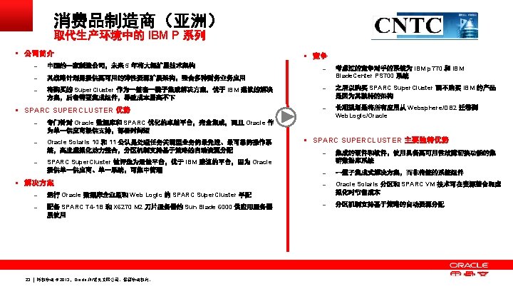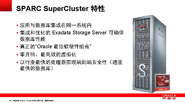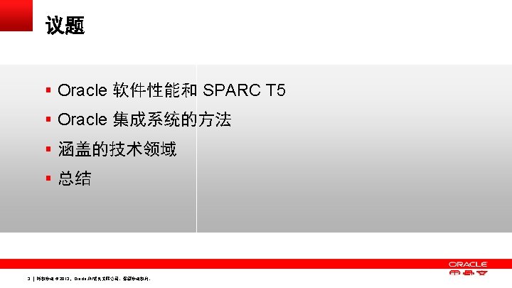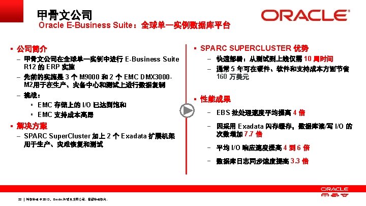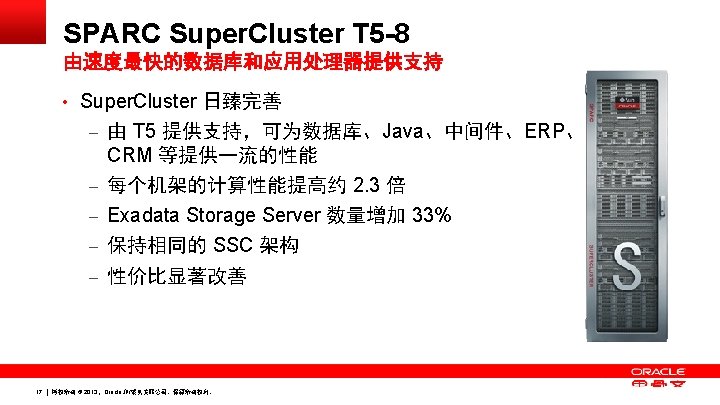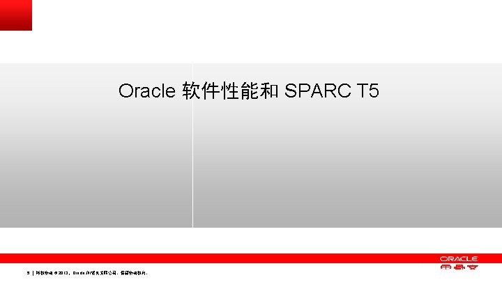 必要的基准测试披露声明 针对含基准测试结果的 SPARC T 5 和 M 5 演示文稿(第 1 页,共 2 页) §Copyright 2013, Oracle &/or its affiliates. All rights reserved. Oracle & Java are registered trademarks of Oracle &/or its affiliates. Other names may be trademarks of their respective owners. . §TPC Benchmark C, tpm. C, and TPC-C are trademarks of the Transaction Processing Performance Council (TPC). SPARC T 5 -8 (8/128/1024) with Oracle Database 11 g Release 2 Enterprise Edition with Partitioning, 8, 552, 523 tpm. C, $0. 55 USD/tpm. C, available 9/25/2013, New Order 90 th% Response Time 0. 410 sec. IBM Power 780 Cluster (24/192/768) with DB 2 ESE 9. 7, 10, 366, 254 tpm. C, $1. 38 USD/tpm. C, available 10/13/2010, New Order 90 th% Response Time 2. 10 sec. IBM x 3850 X 5 (4/40/80) with DB 2 ESE 9. 7, 3, 014, 684 tpm. C, $0. 59 USD/tpm. C, available 7/11/2011. IBM x 3850 X 5 (4/32/64) with DB 2 ESE 9. 7, 2, 308, 099 tpm. C, $0. 60 USD/tpm. C, available 5/20/2011. IBM Flex x 240 (2/16/32) with DB 2 ESE 9. 7, 1, 503, 544 tpm. C, $0. 53 USD/tpm. C, available 8/16/2012. IBM Power 780 (2/8/32) with IBM DB 2 9. 5, 1, 200, 011 tpm. C, $0. 69 USD/tpm. C, available 10/13/2010. Source: http: //www. tpc. org/tpcc, results as of 3/26/2013. § SPEC and the benchmark name SPECj. Enterprise are registered trademarks of the Standard Performance Evaluation Corporation. Results from www. spec. org as of 3/26/2013. SPARC T 5 -8, 57, 422. 17 SPECj. Enterprise 2010 Ej. OPS; SPARC T 4 -4, 40, 104. 86 SPECj. Enterprise 2010 Ej. OPS; Sun Server X 2 -8, 27, 150. 05 SPECj. Enterprise 2010 Ej. OPS; Cisco UCS B 440 M 2, 26, 118. 67 SPECj. Enterprise 2010 Ej. OPS; IBM Power 780, 16, 646. 34 SPECj. Enterprise 2010 Ej. OPS. IBM Power. Linux 7 R 2, 13, 161. 07 SPECj. Enterprise 2010 Ej. OPS. SPARC T 3 -4 9456. 28 SPECj. Enterprise 2010 Ej. OPS. SPARC T 5 -8 (SPARC T 5 -8 Server base package, 8 x. SPARC T 5 16 -core processors, 128 x 16 GB-1066 DIMMS, 2 x 600 GB 10 K RPM 2. 5. SAS-2 HDD, 4 x Power Cables) List Price $268, 742. IBM Power 780 (IBM Power 780: 9179 Model MHB, 8 x 3. 86 GHz 16 -core, 64 x one processor activation, 4 x. CEC Enclosure with IBM Bezel, I/O Backplane and System Midplane, 16 x 0/32 GB DDR 3 Memory (4 x 8 GB) DIMMS-1066 MHz Power 7 Co. D Memory, 12 x Activation of 1 GB DDR 3 Power 7 Memory, 5 x Activation of 100 GB DDR 3 Power 7 Memory, 1 x Disk/Media Backplane. 2 x 146. 8 GB SAS 15 K RPM 2. 5. HDD (AIX/Linux only), 4 x AC Power Supply 1725 W) List Price $992, 023. Source: Oracle. com and IBM. com, collected 03/18/2013. SPEC and the benchmark name SPECj. Enterprise are registered trademarks of the Standard Performance Evaluation Corporation. Results from www. spec. org as of 5/1/2013. SPARC T 5 -8, 27, 843. 57 SPECj. Enterprise 2010 Ej. OPS; IBM Power 780, 10, 902. 30 SPECj. Enterprise 2010 Ej. OPS. Oracle server only hardware list price is $298, 494 and total hardware plus software list price is $1, 565, 092 http: //www. oracle. com as of 4/24/2013. IBM server only HW list price is $835, 555 and HW+SW cost of $2, 174, 152. 00 and BM Power. Linux 7 R 2 server total hardware plus software cost of $819, 451. 00 based on public pricing from http: //www. ibm. com as of 4/24/2013. §SPEC & the benchmark name SPECjbb are registered trademarks of Standard Performance Evaluation Corporation (SPEC). Results as of 3/26/2013, see http: //www. spec. org for more information. SPARC T 5 -2 75, 658 SPECjbb 2013 -Multi. JVM max-j. OPS, 23, 334 SPECjbb 2013 -Multi. JVM critical-j. OPS. Sun Server X 2 -4 65, 211 SPECjbb 2013 -Multi. JVM max-j. OPS, 22, 057 SPECjbb 2013 -Multi. JVM critical-j. OPS. Sun Server X 3 -2 41, 954 SPECjbb 2013 -Multi. JVM max-j. OPS, 13, 305 SPECjbb 2013 -Multi. JVM critical-j. OPS. SPARC T 4 -2 34, 804 SPECjbb 2013 -Multi. JVM max-j. OPS, 101 SPECjbb 2013 -Multi. JVM critical-j. OPS. HP Pro. Liant DL 560 p Gen 8 66, 007 SPECjbb 2013 -Multi. JVM max-j. OPS, 16, 577 SPECjbb 2013 -Multi. JVM critical-j. OPS. HP Pro. Liant ML 350 p Gen 8 40, 047 SPECjbb 2013 -Multi. JVM max-j. OPS, 12, 308 SPECjbb 2013 -Multi. JVM critical-j. OPS. Supermicro X 8 DTN+ 20, 977 SPECjbb 2013 -Multi. JVM max-j. OPS, 6, 188 SPECjbb 2013 -Multi. JVM critical-j. OPS. HP Pro. Liant ML 310 e Gen 8 12, 315 SPECjbb 2013 -Multi. JVM max-j. OPS, 2, 908 SPECjbb 2013 -Multi. JVM critical-j. OPS. Intel R 1304 BT 6, 198 SPECjbb 2013 -Multi. JVM max-j. OPS, 1, 722 SPECjbb 2013 -Multi. JVM critical-j. OPS, HP DL 980 G 7 106, 141 SPECjbb 2013 -Multi. JVM max-j. OPS, 23268 SPECjbb 2013 -Multi. JVM critical-j. OPS. 44 版权所有 © 2013,Oracle 和/或其关联公司。保留所有权利。