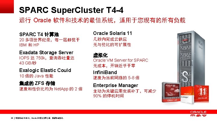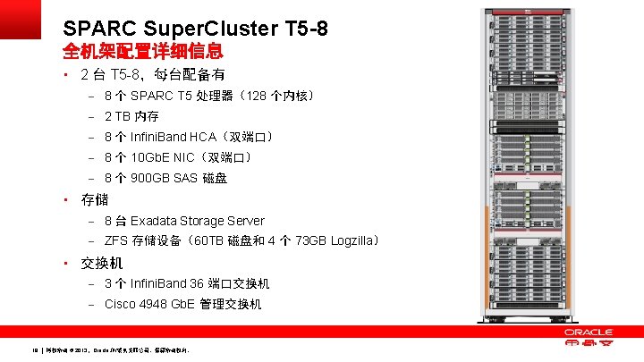 SPARC T 5 -2 SPECjbb 2013 Multi-JVM 创造了新的实际企业 Java 基准测试的 2 芯片的新世界纪录 SPARC T 5 40, 000 30, 000 § SPARC T 5 比 HP E 5 -2690 快 1. 9 倍 SPECjbb 2013 每芯片 SPARC T 5 比 HP x 86 快 1. 9 倍 § SPARC T 5 比 HP E 7 -4870 快 2. 23 倍 § IBM Power 7+ 仅发布 SPECjbb 2005,SPEC 于 2013 年 7 月淘汰旧的基准测试 Westmere Xeon E 7 SPARC T 4 10, 000 Sandy Bridge Xeon E 5 -2690 20, 000 0 SPARC T 5 -2 HP ML 350 p SPARC T 4 -2 HP DL 980 9 版权所有 © 2013,Oracle 和/或其关联公司。保留所有权利。 最大 j. OPS 关键 j. OPS 106, 141 23, 268 SPARC T 5 -2(2 芯片) 3. 6 GHz SPARC T 5 75, 658 23, 334 HP DL 560 p 4 芯片 2. 7 GHz E 5 -4650 67, 850 16, 199 HP ML 350 p 2 芯片 2. 9 GHz E 5 -2690 40, 047 12, 566 SPARC T 4 -2 2. 85 GHz SPARC T 4 34, 804 10, 101 应用服务器 Multi-JVM 结果 处理器 HP DL 980 G 7 8 芯片 2. 4 GHz E 7 -4870 参见基准测试披露幻灯片