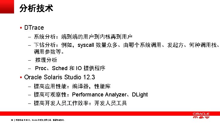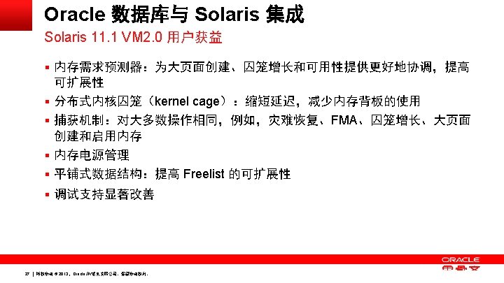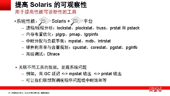 提高 Oracle 数据库的可观察性 下一代数据库提高 I/O 性能的可诊断性 § Dtrace 与数据库监视框架紧密集成 § 添加了新的 v$kernel_io_outlier 视图,用于报告有关 ASM 和原始存储的 IO 响应时间详情 – 36 SQL> desc v$kernel_io_outlier Name Null? Type --------------------- TIMESTAMP NUMBER IO_SIZE NUMBER IO_OFFSET NUMBER DEVICE_NAME VARCHAR 2(513) PROCESS_NAME VARCHAR 2(64) TOTAL_LATENCY NUMBER SETUP_LATENCY NUMBER QUEUE_TO_HBA_LATENCY NUMBER TRANSFER_LATENCY NUMBER CLEANUP_LATENCY NUMBER PID NUMBER CON_ID NUMBER 版权所有 © 2013,Oracle 和/或其关联公司。保留所有权利。