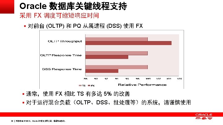 T 5 -8 TPC-C 基准测试:OLTP 数据库居于领先地位 创世界纪录的 OLTP 单系统性能 服务器 插槽,内核 处理器 Oracle SSC 27 n x 4 ch SPARC T 3 IBM Power 780 3 n x 8 ch 3. 86 Power 7 Oracle T 5 -8 8, 128 3. 6 SPARC T 5 IBM p 595 32, 64 5. 0 Power 6 Oracle X 4800 8, 80 2. 4 Xeon E 7 Cisco UCS 2, 16 2. 9 E 5 -2690 IBM Power 780 2, 8 4. 14 Power 7 软件 Oracle 11 g DB 2 9. 7 Oracle 11 g DB 2 9. 5 tpm. C 30. 2 M 10. 3 M 8. 55 M 6. 0 M 5. 0 M 1. 6 M 1. 2 M 美元/tpm. C 1. 01 美元 1. 38 美元 0. 55 美元 2. 81 美元 0. 94 美元 0. 47 美元 0. 69 美元 • 创世界纪录的单系统 TPC-C 8552523 tpm. C • SPARC T 5 -8 存储提供 3. 1 M IOPs • 与 IBM 配置相比,SPARC T 5 每芯片性能快 2. 4 倍 • 相比 3 节点 IBM p 780(总芯片数为 24 个,tpm. C 为 10. 3 M),Oracle 的性价比 提高 2. 5 倍 • 与 IBM p 780 集群相比,SPARC T 5 的响应速度提高 5 倍(新订单率 90%) 6 版权所有 © 2013,Oracle 和/或其关联公司。保留所有权利。 参见基准测试披露幻灯片