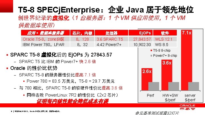T 5 -8 SPECj. Enterprise:企业 Java 居于领先地位 创世界纪录的 SPECj. Enterprise 2010 性能 应用服务器 芯片,内核 处理器 Ej. OPs 软件 Oracle T 5 -8 Oracle 4 x T 4 -4 Oracle X 4800 M 2 IBM Power 780 8 c IBM PL 7 R 2 8 c IBM X 3650 8, 128 16, 128 8, 80 8, 64 2, 16 3. 6 SPARC T 5 3. 0 SPARC T 4 2. 4 GHz E 7 -8870 3. 86 Power 7 4. 2 Power 7+ 2. 9 E 5 -2690 57, 422. 17 40, 104. 86 27, 150. 05 16, 646. 34 12, 062. 46 9, 696. 43 WLS 12. 1 WLS 10. 3 WLS 12. 1 WS 7. 0 WS 8. 5 § SPARC T 5 -8 应用和 T 5 -8 数据库实现了 57422. 17 Ej. OPs – T 5 -8 的应用层性价比比 提高 12. 7 倍:Power 780 = 99. 2 万美元,T 5 -8 = 26. 9 万美元 – T 5 -8 比 8 芯片 IBM Power 780 快 3. 4 倍,比 Power 7 每内核快 1. 7 倍 § SPARC T 5 -8 比 8 芯片 x 86 Xeon E 7 -8870 快 2. 1 倍 § SPARC T 5 -8 数据库服务器仅使用了 40%,提供足够的备用空间 7 版权所有 © 2013,Oracle 和/或其关联公司。保留所有权利。 参见基准测试披露幻灯片