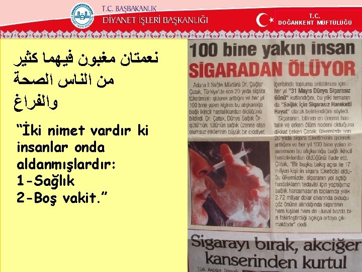 T. C. DOĞANKENT MÜFTÜLÜĞÜ Kıymeti Bilinmeyen Nimet: Sağlık Yüce Rabbimiz yaşadığımız şu dünyada sayısız birçok nimet vermiştir. Kur’an şöyle der: ﻥ ﻭ ﺍﻟ ﻻ ﻭﺍ ﺍﻟ ﻭ ﻳ “Allahın nimetlerini saymaya kalksanız sayamazsınız” (Nahl, 18) • Sağlık da bize verilen nimetlerdendir. Bu sebeple bedenimizi nerede ne şekilde kullandığımızdan hesaba çekileceğiz. www. dogankentmuftulugu. gov. tr