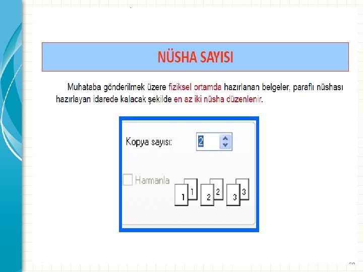 SAYI BÖLÜMÜ Belgelerde sayı bulunması zorunludur. “Sayı: ” sırasıyla; DETSİS’te belirtilen T. C. Devlet Teşkilatı Numarası, standart dosya planı kodu ile belge kayıt numarasından oluşur ve bunların arasına kısa çizgi işareti (-) konulur. Sayı: 26002637 – 665. 01 - 888 Devlet Teşkilat Numarası Kodu Standart Dosya Planı Kodu Belge Kayıt Numarası