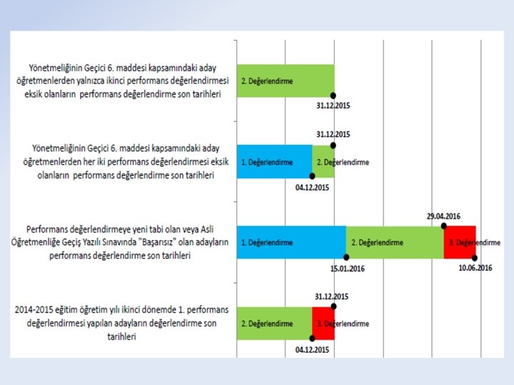 Aday Öğretmenlerin Değerlendirme Durumları 1. Grup 2. Grup 3. Grup 4. Grup 14. 03. 2014 tarihinden önce atananlar (Hazırlayıcı Eğitim-Temel Eğitim süreci) 14. 03. 2014– 5 Şubat 2015 arasında atananlar (İki Değerlendirme Yapılır. Geçici 6. Madde) 5 Şubat 2015 sonrası atananlar (Üç Değerlendirme Yapılır) Şubat 2016 sonrasında atanacaklar (6 aylık değerlendirme sürecine tabi olanlar)