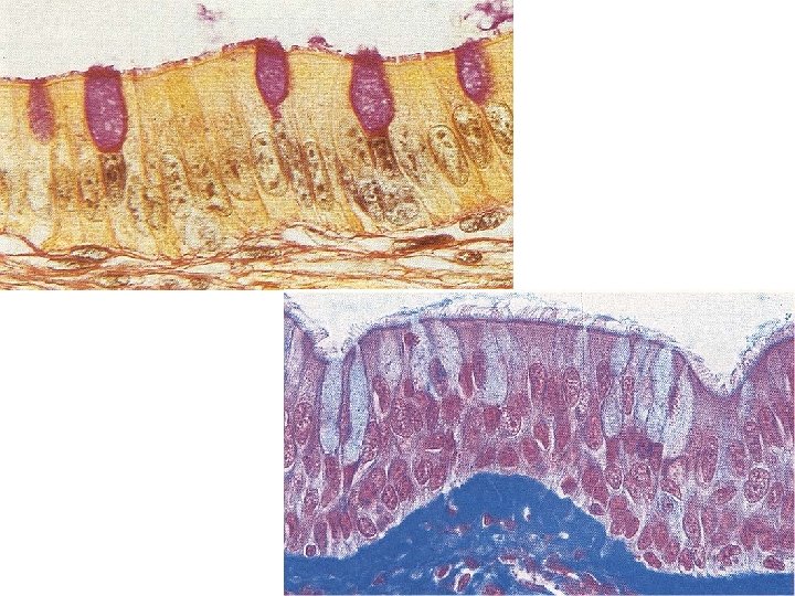 Cellule Caliciformi • Secernono mucina, protettiva e lubrificante • Intersperse tra cellule ciliate della trachea e dei bronchi • Intersperse tra le altre cellule secernenti ed assorbenti del trato gastro-intestinale • Rimpiazzate dopo ogni ciclo di attività Microvilli Teca Granuli di mucinogeno Stelo Nucleo