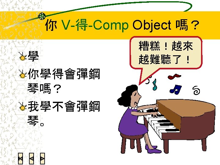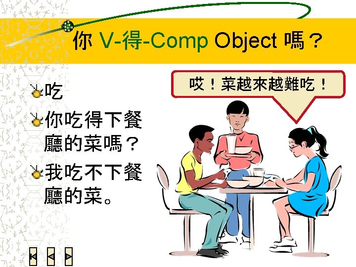 Potential complement V 得 Complement can get result by V -ing 老師的話我聽得懂。 V 不 Complement cannot get result by V-ing 他買不到飛機票。
