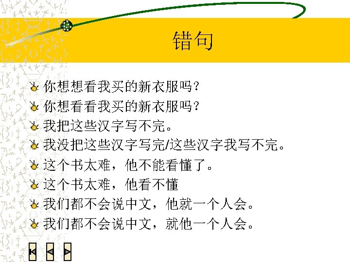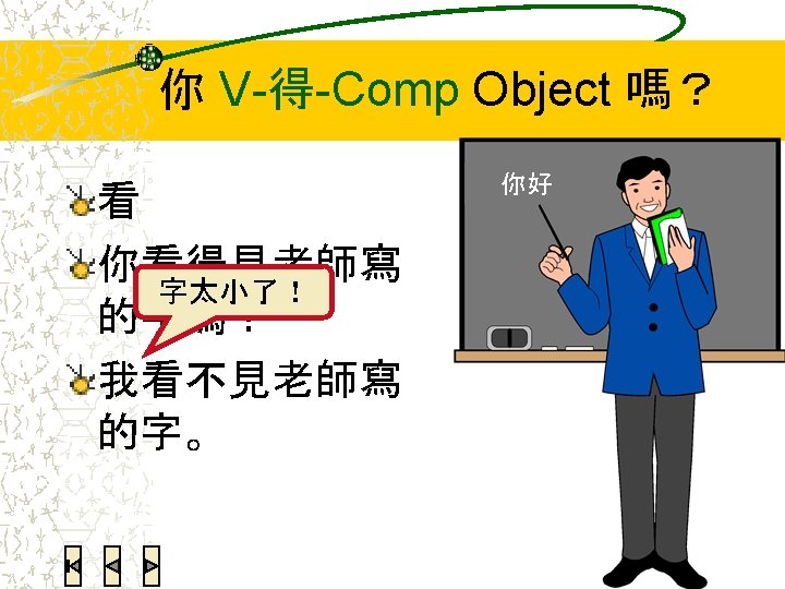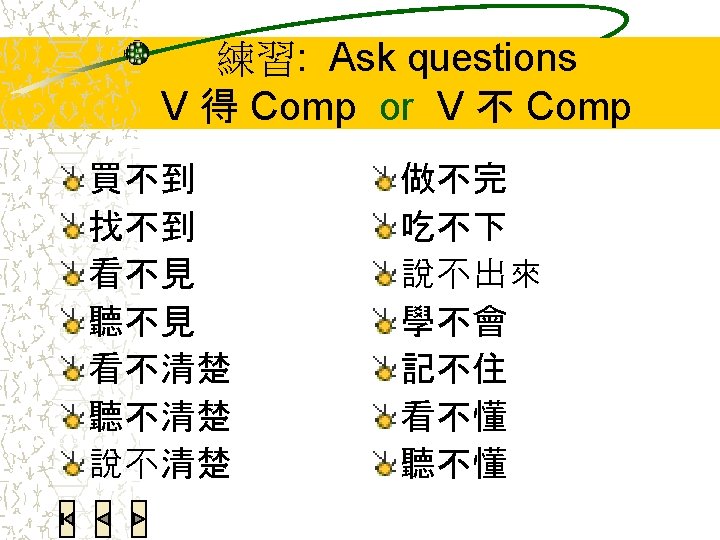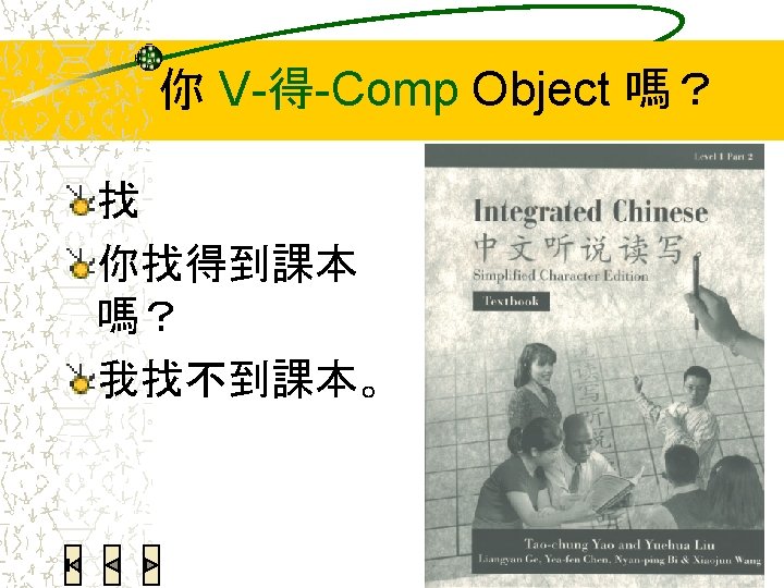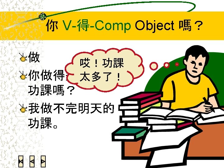 语法练习:翻译 Today’s homework is not a lot. I can finish it. 今天的功课不多,我做得完。 You speak too fast. I can’t understand you. 你说话说得太快了,我听不懂。 He is the only one in the Chinese class who can speak Japanese. 我们的中文班就他会说日文。 I successfully bought the movie ticket. 电影票我买到了。