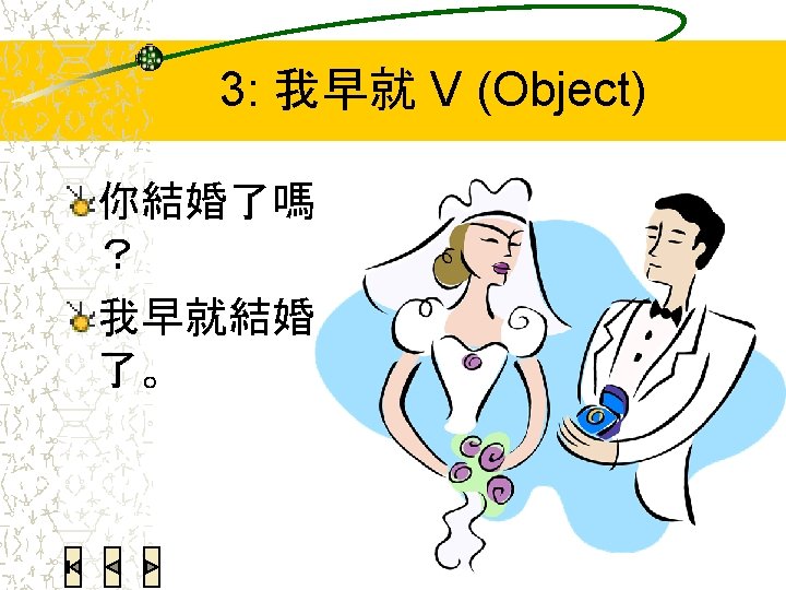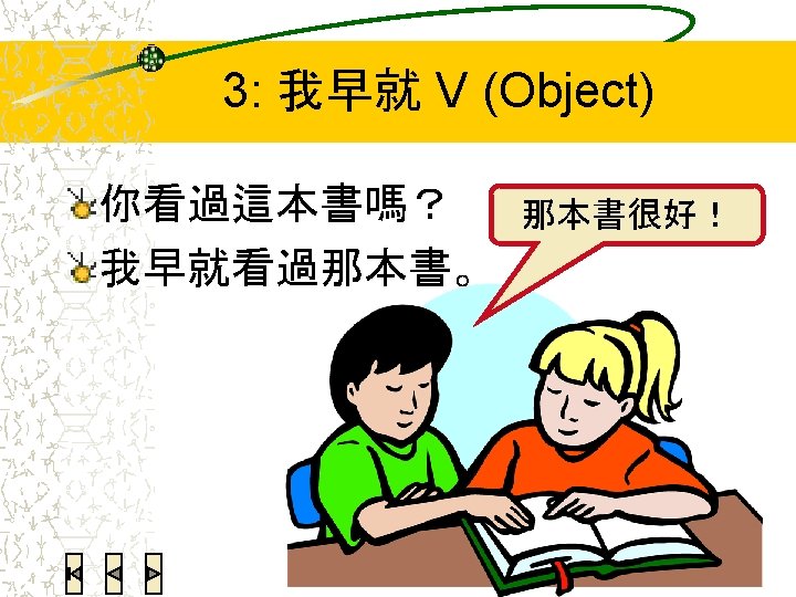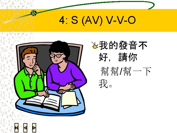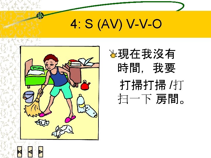 4: Reduplicated verbs Note that V-O verbs need to split, with only the verb part reduplicated. Plain disyllabic verbs never split. Using eduplicated verbs is usually even more politer than “一下” § V-O V-V-O 看書 看看書 § Disyllabic verb 打掃房子 打掃打掃房子
