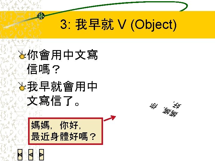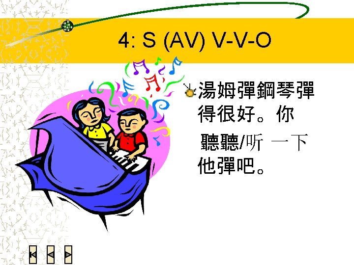 Reduplicated verbs Subject Verb-Verb 我看看吧。 S AV Verb-Verb Object 她想聽聽錄音。 S AV Verb-Verb O 我得整理整理房子。 Do something a little, softens tone of request