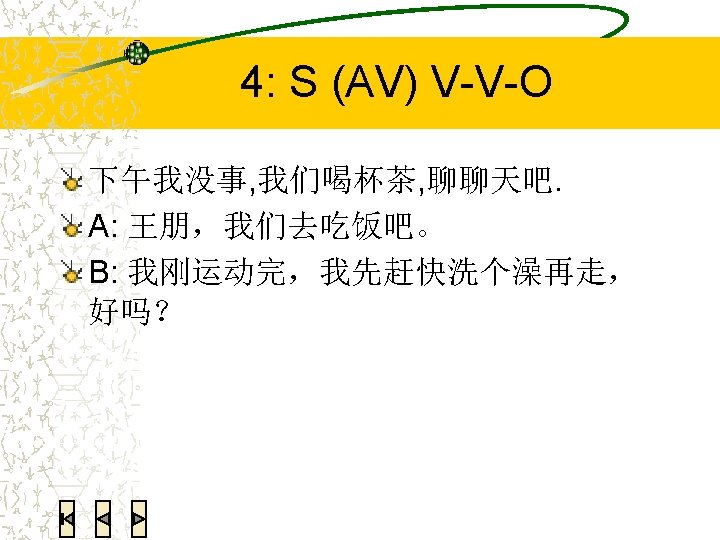 4: S (AV) V-V-O 你想不想 跳跳/跳个舞? Note: closely bound V-O usually can’t use “一下”。 “个” or “点儿” are more proper