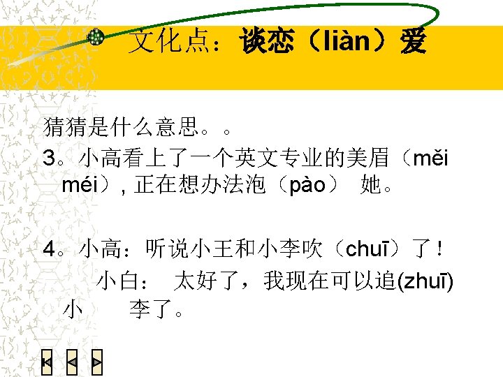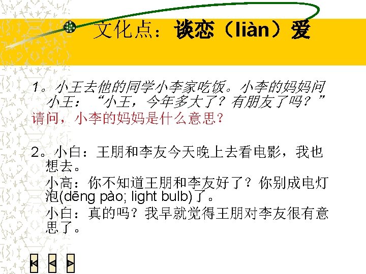 听力练习 (T F) Mr. Fei is calling to ask Li you about Gao xiao yin’s birthday party. (T F) Li You doesn’t like Mr. Fei very much. (T F) Mr. Fei is Gao xiao yin’s high school classmate (T F) According to Li you, she is busy this weekend because she has to clean up her dorm room. (T F) According to Li you, she had to finish the conversation with Mr. Fei because she