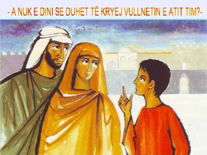 Së bashku me Jozefin, edhe ti, o Mari mbetesh e habitur, por, duke parë Jezusin nuk mund të rrish pa pyetur: “Përse na e bëre këtë? Ishim shumë në ankth për ty”. Dhe ai përgjigjet: “Pse më kërkuat? A nuk e dini se duhet të kujdesem për punët e Atit tim? ”. “Por ata nuk i kuptuan fjalët e Tij”. Pra, o Mari, edhe ti, ashtu si shumë nëna, nuk i kuptove zgjedhjet e birit tënd. Duhet të ketë qenë një moment i vështirë, edhe pse kishe pranuar planin e Hyjit. O Mari, kjo ngjarje të afron me përvojën e shumë nënave dhe baballarëve që ndonjëherë kanë marrëdhënie të vështira me fëmijët e tyre. Lutu për ta, ndriçoji që ta ndjekin me dashuri dhe dituri rritjen e fëmijëve të tyre.