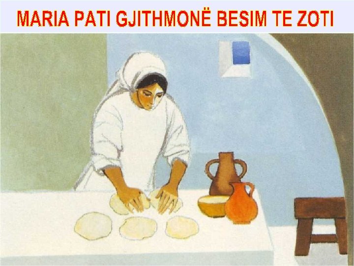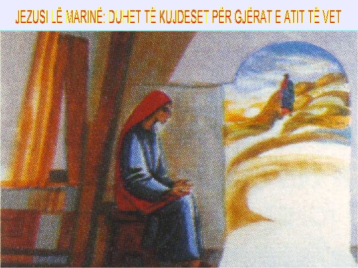 Ti, o Mari, ishe një grua shumë e re, një vajzë si gjithë të tjerat në fshatin tënd të vogël. Por, pikërisht Ty, i Tejlarti të dërgoi engjëllin e vet. Ai të zgjodhi si bashkëpunëtoren e planit të tij më të rëndësishëm: të dërgojë në botë Shpëtimtarin. Ti je personi më i dashur i zemrës së Tij. Edhe ne, o Mari, të shikojmë me dashuri dhe gëzohemi për gjithçka që Hyji deshi të bënte në Ty dhe së bashku me Ty.