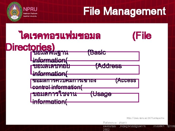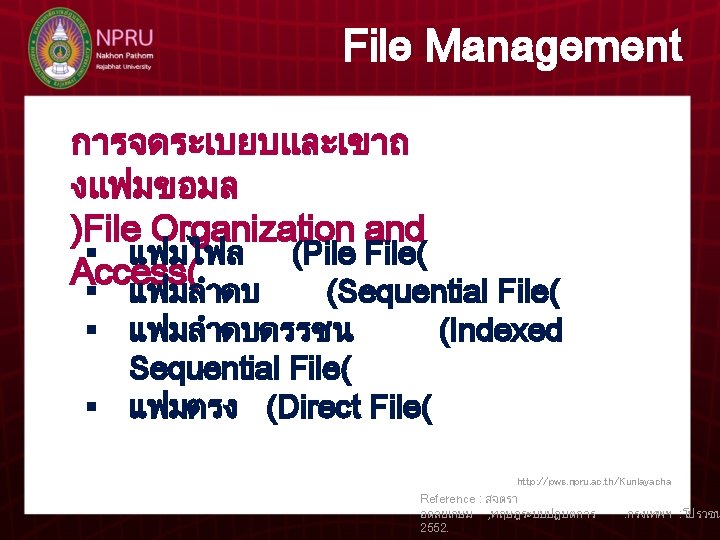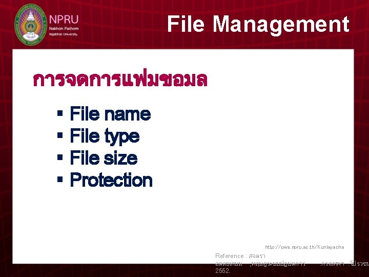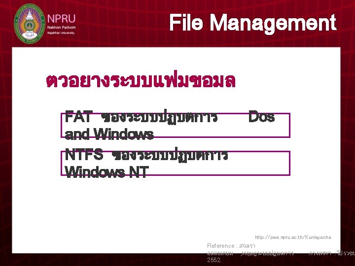 T Kunlaya Charoenmongkonvilai 5 File Management File Management Slides: 7 Download presentation T. Kunlaya Charoenmongkonvilai บทท 5 การจดการแฟมขอมล File Management File Management Logical File System File- organization Module Basic File System I / O Control http: //pws. npru. ac. th/Kunlayacha Reference : สจตรา อดลยเกษม , ทฤษฎระบบปฏบตการ 2552. . กรงเทพฯ : โปรวชน