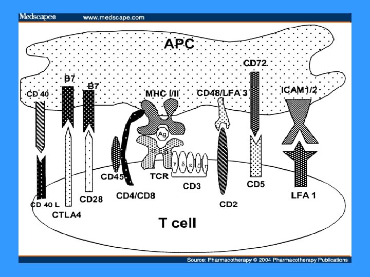 TCR § TCR (T cell receptor) se skládá z modulu rozeznávajícího Ag a asociovaného CD 3 komplexu, který je nezbytný pro přenos signálu, je propojen s PTK (Src) § Modul rozeznávající Ag je tvořen 2 řetězci a ( , d), N-terminální části tvoří vazebné místo pro Ag § T lymfocyty ( ) rozeznávají komplex MHC gp-Ag peptid na povrchu APC, při rozpoznání spolupracuje TCR s koreceptory CD 4 (pomáhá vázat MHC gp II) nebo CD 8 (pomáhá vázat MHC gp I) § Aktivace přes TCR a CD 28 vede k proliferaci a diferenciaci v efektorové buňky § CD 28 – receptor kostimulačního signálu, váže ligandy CD 80 a CD 86, které jsou na povrchu APC