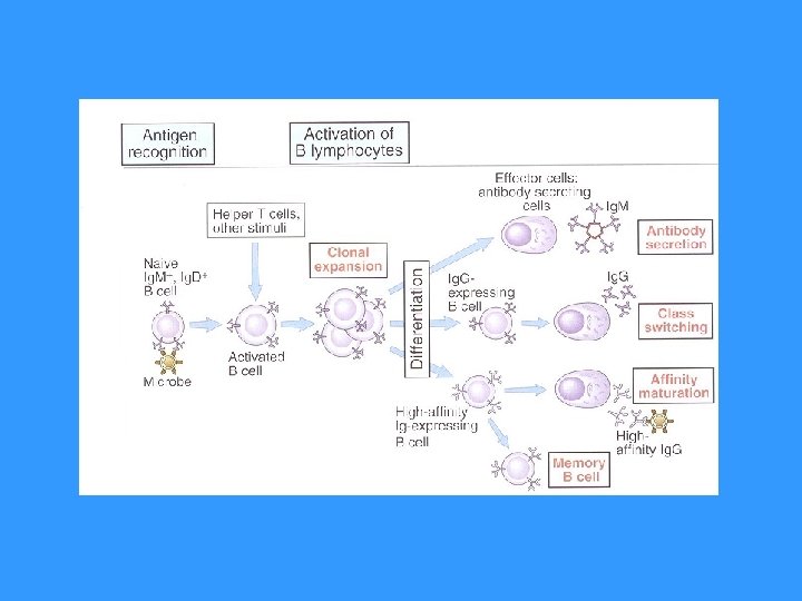 § V sekundární fázi imunitní reakce vznikají protilátky s vyšší afinitou k Ag a s jinými efektorovými vlastnostmi závislými na izotypu, vznikají také paměťové bb pro další setkání s Ag § Protilátky v organismu po primární infekci přetrvávají po dlouhou dobu § Kontakt mezi CD 40 (B lymfocyt) a CD 40 L (TH 2 lymfocyt) je nezbytný pro zahájení somatických mutací, izotypového přesmyku a vznik paměťových bb.