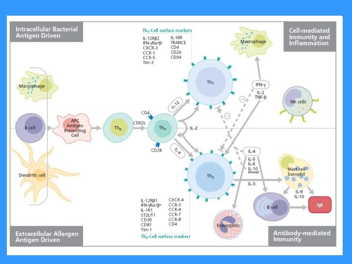 Mutual regulation of activities TH 1 versus TH 2 § Whether the TH precursor cell will develop into TH 1 or TH 2 decides cytokine ratio of IL-12 and IL-4 § IL-12 is produced by macrophages and dendritic cells stimulated by certain microorganisms § IL-4 is produced by activated basophils and mast cells § TH 1 cytokines produced (mainly IFNg) inhibit the development of TH 2 and stimulate the development of TH 1 (IL-2 stimulates also TH 2) § Cytokines produced by TH 2 (IL-4, IL-10) inhibit the development of TH 1 and stimulate the development of TH 2 § TH 3 development is stimulated by a specific cytokine environment (IL-4, IL-10, TGFb); TH 3 produce TGFb and cooperate with B cells in MALT