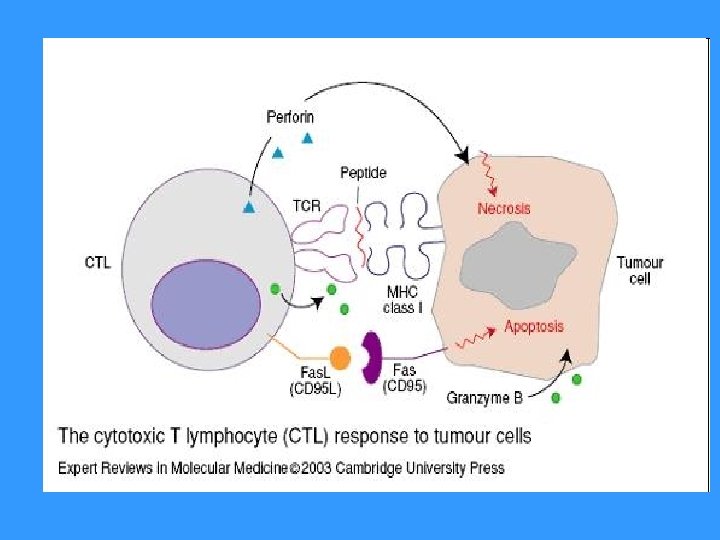 Effector functions of TC § Cytotoxic granules containing perforin and granzymes (perforin creates pores in the cytoplasmic membrane of target cell, in some cases may lead to osmotic lysis of the target cell, formed pores in the cell receiving granzymes that cause the target cell to die by apoptosis. § Fas ligand (Fas. L) - which binds to the apoptotic receptor Fas (CD 95) presented on the surface of many different cells (also on the surface of TC) § TNF