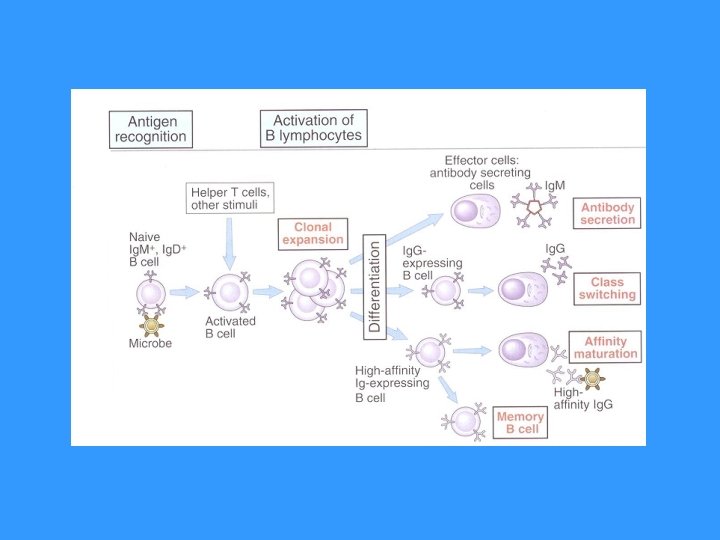 Secondary phase of antibody response § Recognition of Ag on FDC (If is sufficient amount of immune complexes on FDCs and are recognized by memory B cells) § Under the influence of signals from the FDC (Ag) and TH 2 cells (CD 40 L, cytokines) is again started the proliferation and differentiation of B cells accompanied with somatic mutations → formation of clones of B cells with new BCR → survive only B cells with a BCR with the highest affinity for Ag = affinity maturation of antibodies § There is also isotype switching, which isotypes arise determines cytokine environment